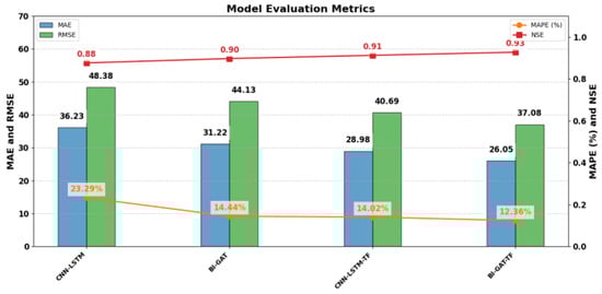The experimental results comparing the proposed prediction model with the baseline models are shown in Figure 5 and Figure 6. From the results, the proposed model achieves the lowest MAE, MAPE (%), and RMSE on both the PEMS04 and PEMS08 datasets. Specifically, in the PEMS04 dataset, the values are 26.05, 12.36, and 37.08, while in the PEMS08 dataset, the values are 19.12, 7.25, and 19.12, respectively. The NSE is also the highest in both datasets, with values of 0.93 and 0.97, respectively. These results indicate that the proposed model achieves optimal performance in terms of prediction error and accuracy. Notably, the experimental results on the PEMS08 dataset outperform those on the PEMS04 dataset. This can be attributed to the fact that the PEMS08 dataset contains a larger number of traffic flow sequences, which provides a longer total sequence length. This increase in sequence length offers a clear advantage in terms of model training and feature extraction. In conclusion, the proposed prediction model demonstrates excellent detection performance on real-world test datasets, achieving more accurate predictions.
