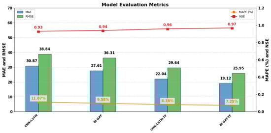 To verify the advantages of the BI-GAT-TF model proposed in this paper, a comparative experiment was conducted with the CNN-LSTM-TF prediction model. Additionally, to assess the effectiveness of the proposed frequency-domain spatial feature extraction in improving the model’s prediction accuracy, an ablation study was performed by removing the frequency-domain feature extraction module from the BI-GAT-TF model and observing the results. For a more intuitive understanding of the impact of frequency-domain feature extraction on the experimental results, a comparison was also made between the traditional CNN-LSTM model and the CNN-LSTM-TF model.