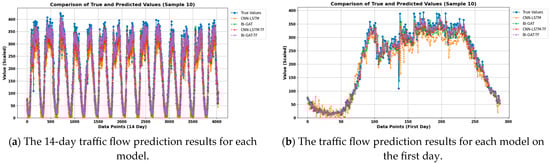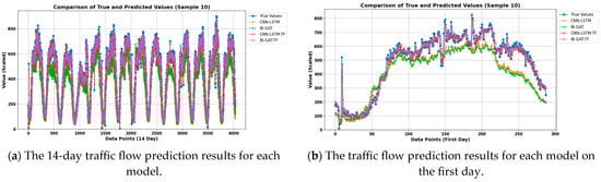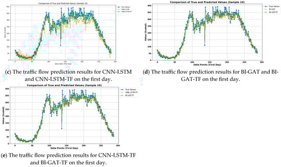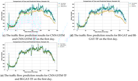 Figure 7 and Figure 8 show the experimental results for node 10 in the PEMS04 and PEMS08 datasets, respectively. (a) shows the 14-day traffic flow prediction results for each model; (b) shows the traffic flow prediction results for each model on the first day; (c) shows the traffic flow prediction results for CNN-LSTM and CNN-LSTM-TF on the first day; (d) shows the traffic flow prediction results for BI-GAT and BI-GAT-TF on the first day; (e) shows the traffic flow prediction results for CNN-LSTM-TF and BI-GAT-TF on the first day.