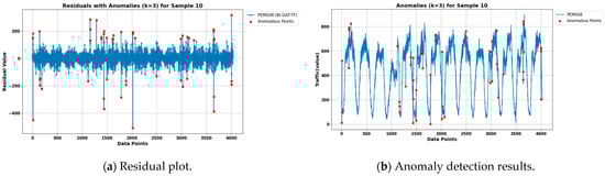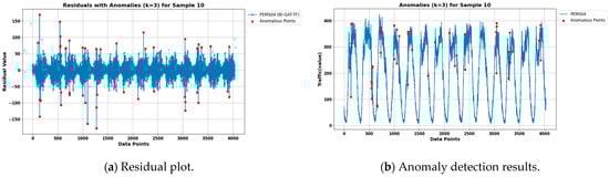 The anomaly detection part first requires determining the error threshold. Set k to 3. According to Chebyshev’s inequality, an error exceeding or is considered to be an outlier for that data point, i.e., at least of the errors should fall within the range of . Combined with the above proposed prediction model, anomaly detection is carried out, and the number of detected anomalies in the PEMS04 and PEMS08 datasets are 46 and 51, respectively. The detection results are shown in Figure 9 and Figure 10. Among them, Figure 9a and Figure 10a display the residual plots for the two datasets, showing the residual range when k = 3 and the detected anomalies in the residual plots. Figure 9b and Figure 10b show the anomalous points detected in the original traffic flow for the two datasets.