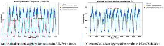 Analysis of the aggregation results shows that in the PEMS04 dataset, the number of anomalies obtained by the aggregation method is 21, and the number of anomalies obtained by this paper’s detection method is 46. Compared with the anomalies obtained by the aggregation method, this paper’s detection method detected 19 of them, and 2 data points were not detected. In the PEMS08 dataset, the number of anomalies obtained by the aggregation method is 30, and the number of anomalies obtained by the detection method in this paper is 51. Compared with the anomalies obtained by the aggregation method, the detection method in this paper detects 29 of them, and 1 data point is not detected.