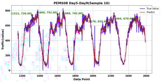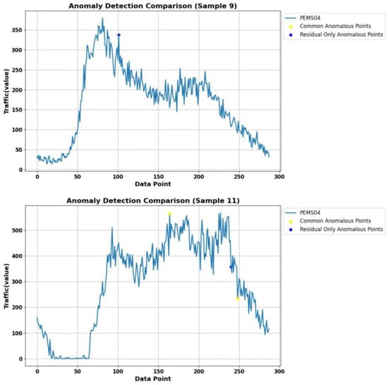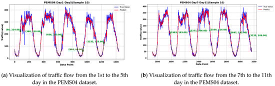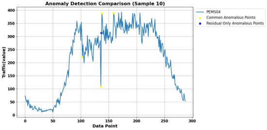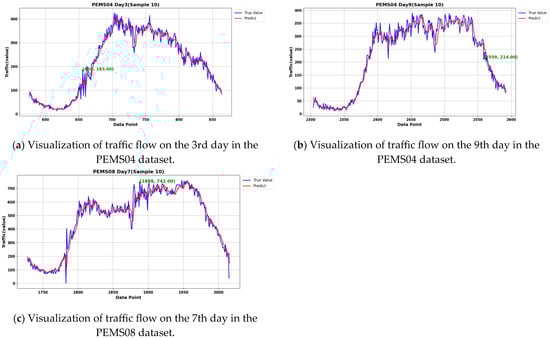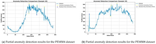 After analysis, the two data points that were not detected in this paper in the PEMS04 dataset were in the time periods of the third and ninth days. Similarly, the one data point in the PEMS08 dataset that appeared to be undetected was in the time period of the seventh day, as shown in Figure 12.