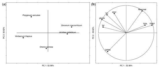 Principal component analysis (PCA) is a statistical approach that reduces the dimensionality of a data set to two principal components (PCs) while maximising the variance of the data. Data from three biological replicates were used for all analyses. In this study, PC 1 explained 52.56% of the variation in the data, while PC 2 increased the total explained variation to 83.18%. Figure 2 shows the results of PCA based on the total phenolic acids, flavonoids and phenolic compounds identified and the antioxidant and anti-hyperglycemic potential of the extracts are shown. It is evident that the species G. macrorrhizum and A. millefolium are grouped together, while the other three species are more dispersed (Figure 2a). The variables that contributed most to the grouping of G. macrorrhizum and A. millefolium were the concentration of total phenolic acids identified and antioxidant capacity as measured by FRAP and Rancimat assays (Figure 2b). The anti-hyperglycemic potential (inhibition of α-glucosidase and α-amylase enzymes), total identified flavonoids and compounds contributed the most to the separation of P. aviculare.