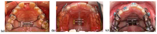 In instances where first premolar anchorage is not available, bonded HYRAX expanders can be attached through acrylic or metal cast splint bonding on the buccal dentition (Figure 1b,c). The expanders with an acrylic cap cover the occlusal, facial, and lingual surfaces of the posterior teeth, raising the bite for patients with anterior occlusal interference []. The study found that there is no significant difference in molar tipping and extrusion between banded and bonded HYRAX expanders [].