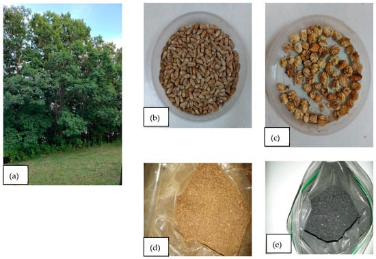 (a) Acorn tree, (b) date seeds, (c) peach seeds, (d) milled acorn, and (e) active carbon from dates.