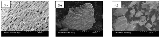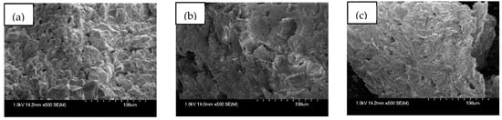 Scanning electron micrographs (SEM) of (a) RAC before adsorption, (b) RAC after Cu adsorption, and (c) RAC after Pb adsorption.
