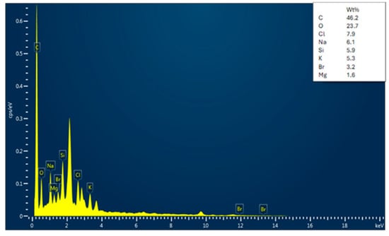 SEM images are shown in Figure 2, Figure 3 and Figure 4. The SEM micrographs show a significant difference in the surface between before and after adsorption. The scanning electron microscopy (SEM) images of all activated samples exhibited an uneven and well-defined porous structure, suggesting a comparatively large surface area. Upon activation, the outer surface of activated carbon exhibits fissures, crevices, and a range of grain sizes within its macroscopic pores. The porous and defective structure of carbon is attributed to the liberation of non-carbon components, such as hydrogen, oxygen, and nitrogen, from the char’s surface during the pyrolysis process [53]. This liberation leads to the creation of a stiff carbon framework with a rudimentary pore structure. An efficient adsorbent requires the presence of pores and an internal surface area. The formation of pores in activated carbon is crucial, as pores serve as active sites, playing a major part in the process of adsorption [54].