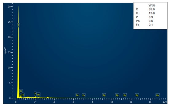 Energy Dispersive X-ray (EDX) spectrum of date seed activated carbon after lead adsorption.