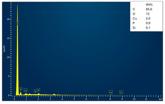 Energy Dispersive X-ray (EDX) spectrum of date seed activated carbon after copper adsorption.
