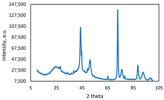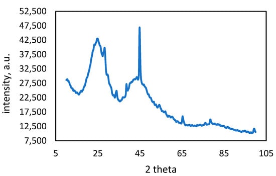 The XRD pattern of activated carbon with adsorbed copper (Figure 8) exhibits peaks located around 43.8°, 51.31°, and 74°. These peaks closely match the characteristic peaks of copper reported in the literature, corresponding to the (111), (200), and (220) planes of FCC copper [55]. The literature confirmed the use of the standard JCPDS card (No. 04-0836) for copper, indicating that the peaks in the activated carbon sample can also be indexed to these crystal planes of copper [56]. This alignment with the literature confirms the presence of copper in the activated carbon and supports its structure as FCC copper [55,56].