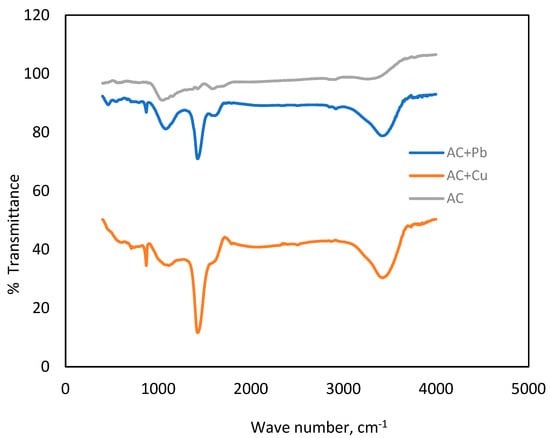 Functional groups significantly influence the surface adsorption capabilities of activated carbon. The FTIR diagram (Figure 10) shows the spectra of activated carbon (AC) and AC after adsorption of Pb and Cu ions. In the pure AC, the broad peak is observed around 3400 cm−1, which is assigned to -OH stretching vibrations, which proves the presence of hydroxyl groups on the surface [57]. The peak around 1600 cm−1 is the C=C stretching peak, which is characteristic of graphitic carbon [58], while the other smaller peak around 1000 cm−1 is due to C-O stretching, which may include carboxyl or hydroxyl groups [59,60].
