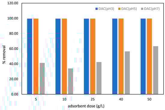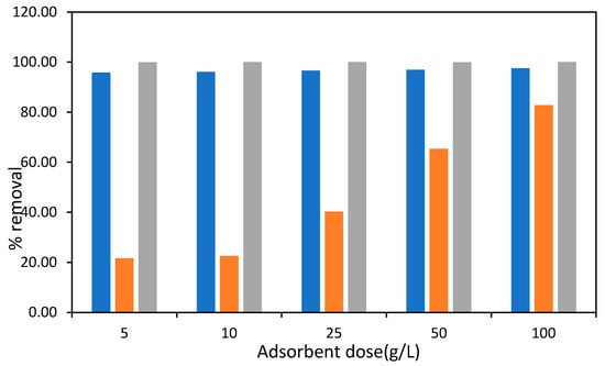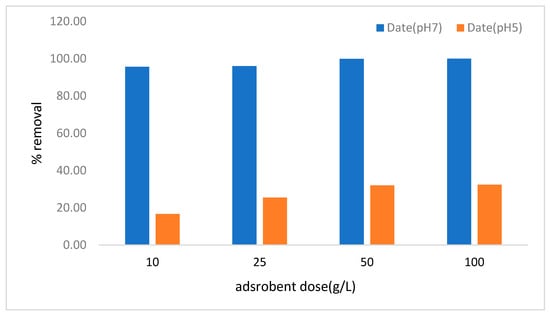 The trend, on the other hand, shows that the increase in the adsorbent dose from 10 g/L to 100 g/L results in a better removal efficiency at both pH levels. This is due to the increased availability of surface area and active adsorption sites with the higher adsorbent doses, which aligns with findings in other previous adsorption studies [72].