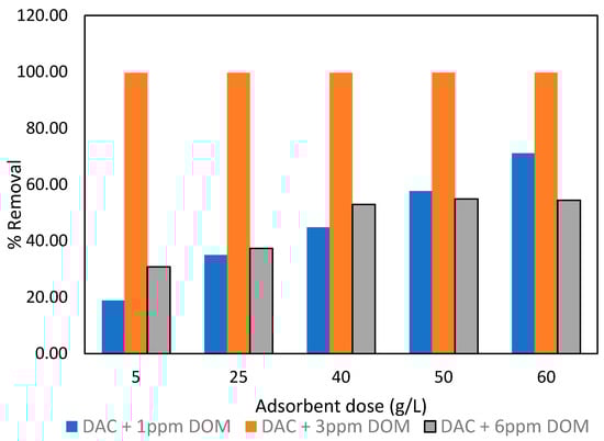 The relationship between heavy metals and dissolved organic matter (DOM) is complex and multifaceted [79,80]. The interaction between soluble organic molecules and metals occurs through processes such as anion exchange, ligand exchange, cationic overlapping, Van der Waals forces, and adsorption [81]. Numerous heavy metals exhibit a pronounced attraction for dissolved organic matter (DOM) and form metal complexes, potentially disrupting the adsorption process. The mobility of metals, their elimination rate, and their ability to adhere to adsorption sites are directly affected by the concentration of dissolved organic matter (DOM) [80]. In order to examine the influence of DOM on the process of lead removal, humic acid doses of 1, 3 and 6 ppm, were employed during the adsorption of lead using DAC. The metal removal rates for these experiments are depicted in Figure 14.