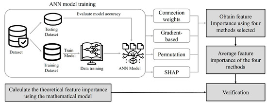 As mentioned above, ANNs have been widely used by researchers to evaluate the relative importance of input features [18,19,20,21,22,23,24]. By feeding the models with values of relevant input features and the corresponding output values of available data points, ANNs can be trained to learn the relationship between output(s) and their input features. Consequently, the trained ANN model can forecast the output values for new data points based on their input feature values as they become available. The process began with the construction of an ANN model through the training of available datasets, analogous to the procedure used for predicting output values. In this study, ANN models were initially developed by training on the available datasets. Then, the four aforementioned methods (the weight connections method, the permutation method, the gradient-based method, and SHAP values) were applied to assess the relative importance of various packaging design features within the trained ANN model. The results of the packaging design feature importance assessment were validated by comparing them with the theoretical feature importance calculated by an analytical method. Figure 1 illustrates the sequential procedure for mapping input feature importance within an ANN model, utilizing the four selected methods.