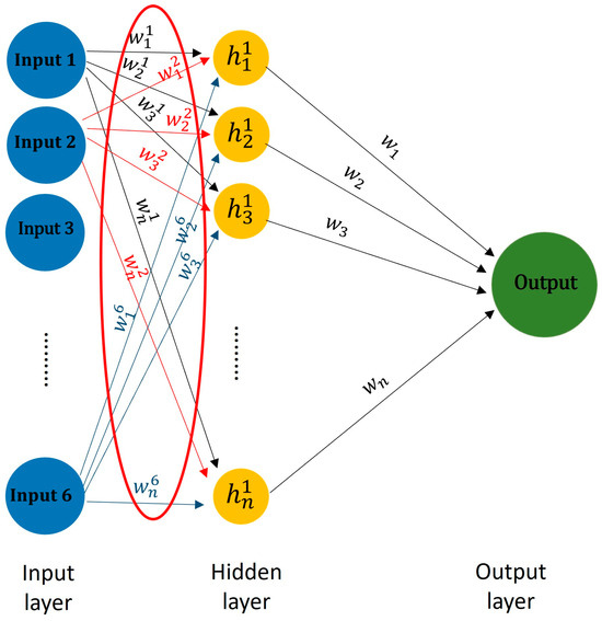 The connection weights method examines the weights between the neurons in an ANN structure to determine the relative significance of each input feature in relation to the output [22]. This approach derives the relative importance of input features by extracting these weights from the first layer, as illustrated in Equation (1) and Figure 3. The weight function was employed to extract the weights from the first layer of the ANN model.