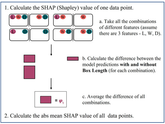 According to Equation (6), the SHAP value of a feature represents its marginal contribution to the model’s prediction, averaged across all possible models with varying combinations of features [42]. Equation (6) determines feature importance for a single data point. In our study, which involves multiple data points, this process is repeated for each data point. The average difference in output across all data points is then used to measure the importance of a single feature. The calculation process of SHAP values for multiple data points in our dataset is illustrated in Figure 4.