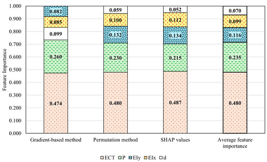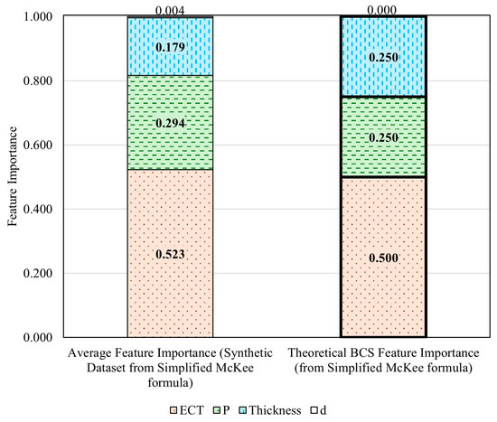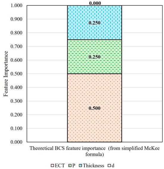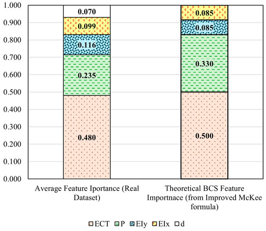 As with the first synthetic dataset, the theoretical relative importance of these five BCS features were calculated using the improved McKee formula (Equation (8)) [45], where the ECT has a weight of 0.500, the perimeter has a weight of 0.330, both stiffnesses EIx and EIy have a weight of 0.085, and depth has no importance (0), as shown in Figure 10.