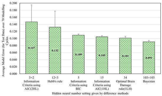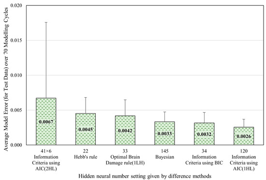 As previously mentioned, the hidden layer neuron number setting was determined through comparing the model errors obtained by the five optimization methods mentioned in Section 2.2 (including Bayesian optimization method, AIC method, BIC method, Hebb’s rule, and the OBD rule) to minimize the model error and maximize the computational efficiency. Figure 6 presents the optimal neuron settings for the hidden layer as determined by each method, along with their corresponding model errors in test data over 70 modeling cycles. The results showed that the AIC method achieved the lowest model errors with one hidden layer and 120 neurons. The BIC method produced the second-lowest model error, with one hidden layer and 34 neurons. The error difference between these two methods was no more than 0.0032, considering their 95% confidence intervals (0.0032 ± 0.0015 and 0.0026 ± 0.0011). This indicates that the more complex configuration suggested by the AIC method was not necessary. In contrast, the simple configuration of 34 provides slightly less accuracy but is significantly more efficient in terms of computational resources, making it the optimal choice for balancing model prediction accuracy and computational efficiency. Consequently, the neuron configuration proposed by the BIC rule was applied throughout the study for this dataset. Namely, the ANN model developed in this real dataset includes a single hidden layer with 34 neurons.