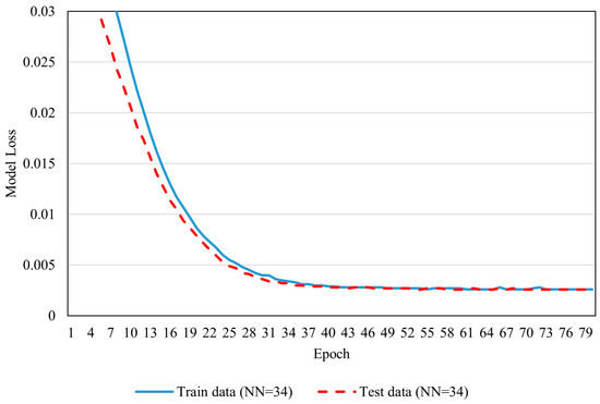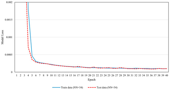 The number of epochs was determined based on the model loss (error) epoch plot (Figure 7), which showed that model error reduction plateaued after 25 epochs, but did not reach zero, meaning the error continued to decrease slowly for both training and test data. To balance high prediction accuracy with computational efficiency, a conservative approach was taken by extending the training for an additional 10 epochs beyond the plateau, resulting in a total of 35 epochs.