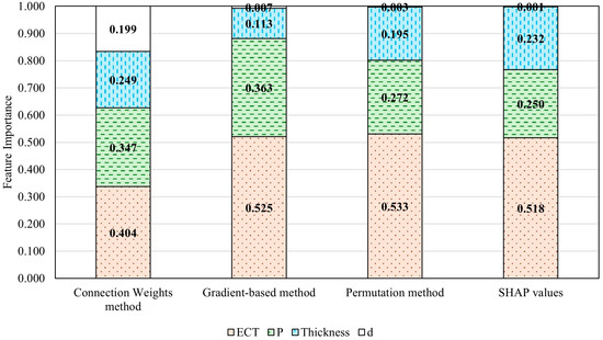 The BCS feature importance in this dataset was evaluated using the four methods mentioned earlier. Each method provided the relative importance of the four BCS features (ECT, thickness of the corrugated board, box perimeter, and box depth). To ensure comparability across methods, the BCS feature importances were normalized so that the sum of the importances for all four features equaled 1 within each method, as illustrated in Figure 8.