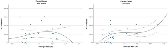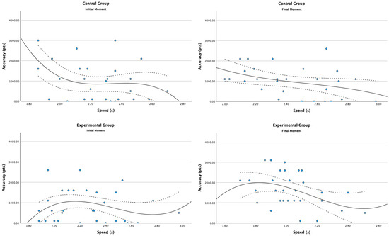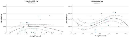 In Figure 3 and Figure 4 we can observe the associations between the throwing accuracy test (pts) and both the sprint speed test (s) and the upper body strength levels (m), taking into account the initial and final moments of each group. In the figures we can see how higher or lower levels of strength or speed imply lower throwing accuracy. That is, there is an intermediate interval of strength and speed in which greater throwing accuracy is achieved. These results can be observed in both groups; however, the throwing accuracy levels (pts) are higher in the experimental group than in the control at the final moment.