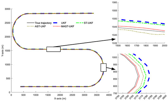 In this simulation, we compared four algorithms, UKF [8], ST-UKF [9], AST-UKF [20], and MAST-UKF, to evaluate their tracking performance in complex traffic scenarios. UKF, as the benchmark method for nonlinear state estimation, was selected to verify the improvement of the adaptive mechanism on nonlinear tracking performance. ST-UKF and AST-UKF represent improved versions in terms of numerical stability and adaptive noise regulation, respectively. Compared with ST-UKF, the aim is to demonstrate that the multidimensional adaptive mechanism is more effective than the one-dimensional square-root improvement; compared with AST-UKF, it shows the superior generalization ability of multidimensional attenuation factors in handling complex motions (such as frequent switching between CV/CA/CT models). These comparisons enable the verification of the MAST-UKF’s tracking performance on moving targets at high speed and wide-range maneuvering conditions.