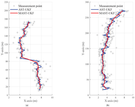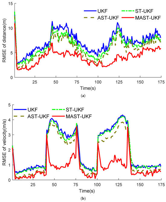 Figure 3a shows the distance error comparison of the filtering algorithms, while Figure 3b shows the velocity error comparison. Based on the simulation results, the tracking performance of five algorithms was analyzed. Among these filtering algorithms, the MAST-UKF algorithm demonstrated the highest estimation accuracy, followed by the ST-UKF and AST-UKF algorithms with similar accuracy. In contrast, the UKF algorithm showed the lowest accuracy. In the simulation experiments, initial abnormal errors were not considered. When the target’s motion state underwent significant changes, the RMSE (root mean square error) of position and velocity increased in the other four filtering algorithms, and they failed to converge quickly. The main reasons for this were mismatched motion models and the impact of measurement outliers. In comparison to other filtering algorithms, MAST-UKF achieved the best estimation accuracy and error convergence when the target underwent large-scale maneuvers. The reason for this is that the MAST-UKF algorithm proposed in this study has strong adaptive adjustment capabilities, which effectively suppress the impact of measurement and motion model errors on estimation accuracy. As a result, the MAST-UKF algorithm demonstrates excellent error adaptive convergence performance when there are significant changes in the target’s motion state.