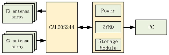 The measured data are entirely sourced from the data collection of a one-way, three-lane section of a road in Xi’an (the scene dataset is the same as in Reference [2]). The baseband signal processor is the ZYNQ-7020, produced by Xilinx, San Jose, CA, USA. The millimeter-wave radar RF chip is the CAL60S244 from Caltech, Pasadena, CA, USA. The hardware architecture of the millimeter-wave radar system is shown in Figure 4. The system is primarily composed of the RF board and the baseband board. The RF board includes the RF chip and the array transceiver antenna module, while the baseband board contains the power module, signal processing module, and storage module. The storage module is used to temporarily store data received by the radar or intermediate processing results, helping to avoid processing bottlenecks caused by data flow rates that exceed processing capacity.
