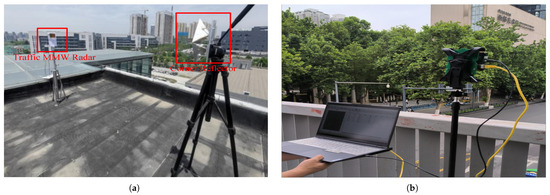 Traffic MMW radar detection system implementation. (a) Calibration of traffic MMW radar; (b) measurement data acquisition.