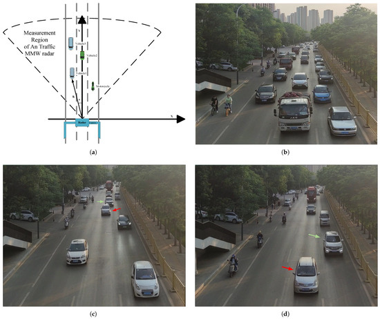 Schematic of the experimental scenario and objectives: (a) geometric relationship diagram between the traffic MMW radar and the target object; (b) traffic scenario during a complex traffic peak period; (c) image of the tracked target vehicle at frame 798; and (d) image of the tracked target vehicle at frame 916.
