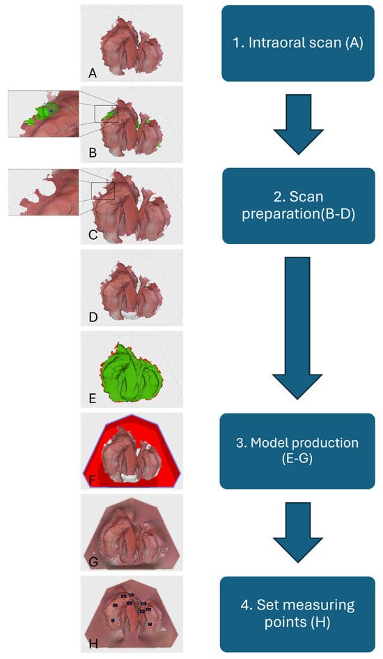 Overview of the steps involved in the digital workflow for computer-aided measurement of unilateral cleft lip and palate according to the Frankfurt approach: intraoral scan of the maxillary segments. The IOS data obtained are imported into the OnxyCeph3TM software (A). In order to ensure the accuracy of the measurement process, it is imperative to meticulously prepare the scan data set. This involves the removal of overlapping structures (B), the supplementation of external areas with digital bridges (C), and their supplementation (D) in the non-relevant areas. The edges of the IOS are trimmed to eliminate any excess or irrelevant data (E). Subsequently, a 3D model is generated from the 3D data set using a base (F,G). The digital cleft palate models can be measured with the module “Evaluation” in OnxyCeph3TM by setting measuring points (H).