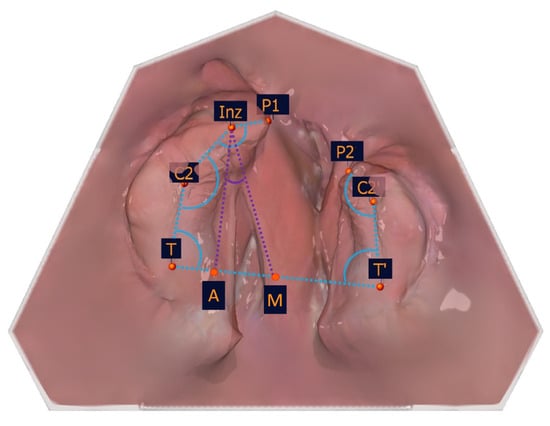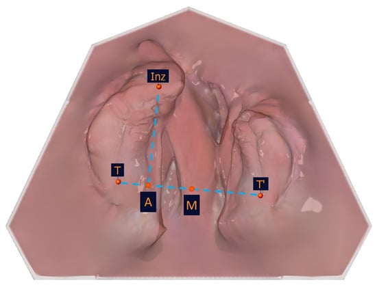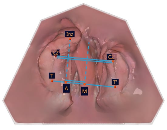 Since the vertical changes in the cleft cannot be assessed from the anatomical points alone without skull-related registration, a reference plane must be constructed. The original definition of a reference plane for the vertical analysis can also be referred to Ashley-Montagu [19]. Defined by connecting the incisor and tuberosity points, he termed it the palatal plane (reference plane). In this context, the use of the incisor point in cleft patients is a challenge, as it is often unsuitable as a reference point due to distortion and delocalization. Therefore, in the vertical measurements, only the respective changes in the two mirrored points C2/C2′ and P1/P2 are considered in relation to each other. It should be mentioned, however, that if the vertical axis alternates in any of the three measuring points (T-T′-Inz), the reference plane is affected, and the distance measurements to the points to be examined (C-P1-P2-C′) are altered.
