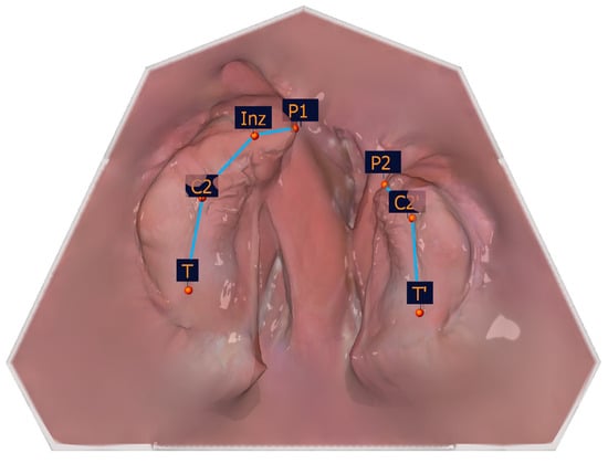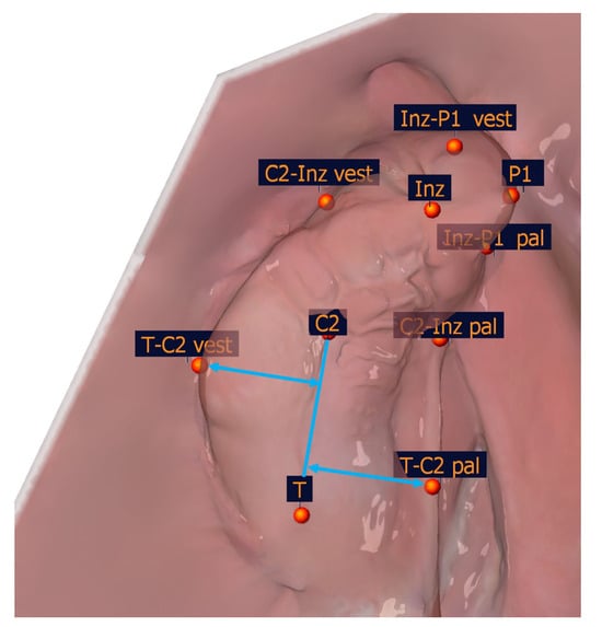 To identify the transversal landmarks, the large and small segments were divided into the subsegments (T-C2, C2-Inz, and Inz-P1 for the large segment and P2-C2′ and C2′-T′ for the small segment). The most vestibular and most palatal points in each section were determined (Table 2, Figure 5).
