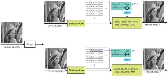 As preparation for DH, the original image O is used as the first cover image , and a copy of the original image is prepared as the second cover image . By applying our proposed DH method to these two cover images, two marked images are produced as the final result. The data embedding procedure involves encoding the secret data using Hamming code, arithmetic coding, and extended EMD. The embedding process is outlined as follows: