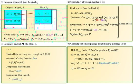 From each block, one pixel is sequentially taken from both blocks to form a codeword P, after which the HC is calculated to obtain the syndrome S. The result of XORing this syndrome S with the binary data m is stored sequentially in M. This process is applied to all pixels in the block, and then AC compression is performed to generate . The compressed binary bits are sequentially converted into quinary numbers, and the extended EMD method is applied to each pixel of the two blocks to hide the data. The dual RDH method proposed in this paper introduces an efficient data hiding scheme that ensures security, enhances data hiding performance, and maintains high image quality.