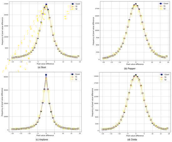 Figure 4 shows the results of analyzing the pixel value difference (PVD) histogram to evaluate data hiding performance. The PVD histogram represents the differences between adjacent pixels in the image, playing a crucial role in assessing how the distribution of pixel values changes after data hiding.