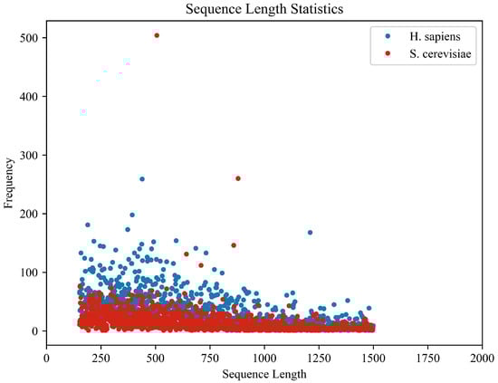 To evaluate LPBERT’s performance on varying protein sequence lengths, we analyzed the length distribution of sequences from two BioGRID [39] datasets previously used in the DeepTrio study. The H. sapiens dataset comprised 38,869 sequences, and the S. cerevisiae dataset contained 17,015 sequences. The sequence length distributions are shown in Figure 3.