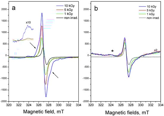 EPR spectra of chestnut peeled seeds irradiated by different doses of γ-rays: (a) 3 days after irradiation; (b) 250 days after irradiation; (*) “satellite” lines due to “cellulose” liked spectrum; (→) pair of lines due to “carbohydrate” spectrum.