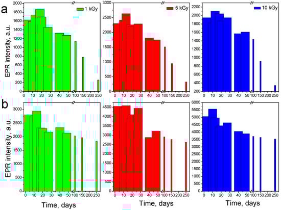 Time stability of the central line in the EPR spectra of irradiated with 1, 5 and 10 kGy horse chestnuts: (a) peeled seeds; (b) shell seeds.