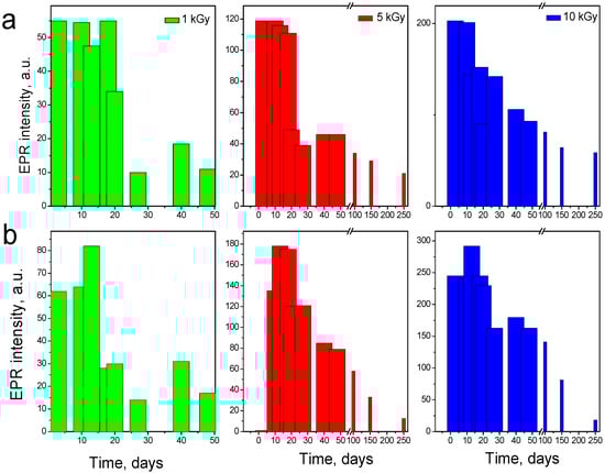 It is known that EPR spectroscopy can be applied for the identification of previous radiation treated products from plant origin (herbs, spices, nuts, etc.). This depends on the life time of the free radicals induced after irradiation. The storage conditions of the samples, as the temperature, humidity and access to light, have an impact on the shelf life of the radicals. It was discovered that at normal storage conditions the “cellulose-like” EPR signal can be observed within a period of 60–80 days after irradiation. However, in the current study this period is longer. Figure 2a exhibits the decay of the central EPR peak with time for the peeled seed samples irradiated by different doses, whereas Figure 2b shows the decay of the shell seeds. It was observed that in the first days after irradiation the intensity increases, and then begins to slowly decrease. Usually when some mechanical treatments are carried out on the samples, it leads to additional creation of free radicals. Very often the radicals are similar to these induced upon irradiation. The horse chestnuts samples were ground before gamma treatment. Probably, the grinding process generates the same kind of free radicals as these occurring in irradiated samples. The natural oxidation of chestnut ingredients, triggered by the exposure of fresh surfaces to atmospheric oxygen, also leads to formation of radicals. So, probably the reason for the observed increase in the intensity of the EPR signals in the first days is just that these radicals, which are more unstable in comparison to the radiation induced radicals, decay for several days. The results show that the EPR signal intensities of irradiated by 1, 5, and 10 kGy peeled seeds decreased with 84%, 86%, and 82%, respectively, for a period of 250 days. For the same time period the intensity of the signal of horse chestnut shells decreased with 35%, 42%, and 37% for 1, 5, and 10 kGy irradiated samples, respectively. It is interesting to mention that in the samples from peeled seeds the intensity of the line recorded at irradiation with 5 kGy is higher in comparison those at 10 kGy. This could be explained by the saturation of the free radicals at higher doses due to recombination. On the other hand, on the whole, higher quantities of free radicals are recorded with shell seeds than peeled seeds. The evidence is the more intensive EPR signal arising from cellulose in the EPR spectrum. Also, in the shell samples, the saturation of the EPR signal at 10 kGy of irradiated samples is not observed. The different behavior of the EPR signal with various kinds of horse chestnut samples (peeled seeds and shell) is probably due to their different composition and water content.