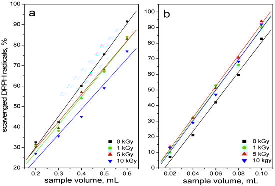 Dependence between percentage of scavenged DPPH radicals and volume (mL) of non-irradiated and irradiated horse chestnut extracts: (a) peeled seeds; (b) shell seeds.