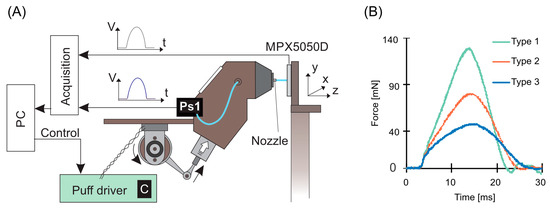 Three distinct settings for high-, medium-, and low-amplitude stimuli were selected (70 V, 55 V, and 45 V, respectively) and are referred to throughout the article as Type 1, Type 2, and Type 3 air-puffs, respectively. The generated air pulses were characterized using a pressure sensor (Ps1; SenSym, Milpitas, CA, USA) incorporated into the air-puff chamber (Figure 1A). Ten readouts from the Ps1 sensor were used to extract both the peak pressure and the duration of the air pulse temporal profiles (Figure 1B). This duration was defined as the time span during which the pressure magnitude exceeded 10% of the peak value. The mean and standard deviations of the amplitude and duration of the air puff were calculated. The sensor Ps1 was also calibrated by an external force sensor, which allowed for expressing the pressure signal from Ps1 in force units. The procedure of calibration was described in an earlier study [11].