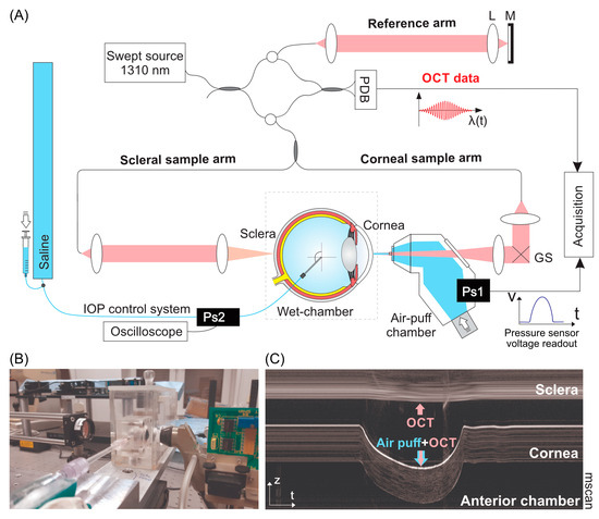 (A) Scheme of the air-puff dual sample arm SS-OCT system. GS—galvo-scanners, PDB—dual-balanced photodetector, M—mirrors, Ps 1—pressure sensor of the air-puff chamber, Ps 2—differential pressure sensor integrated with the saline column. (B) Ex vivo porcine eye in a wet chamber during measurements. The eye was kept in a holder between scleral and corneal sample arms. (C) Representative M-scan presenting both corneal apex and sclera displacements during air-puff stimulation. Directions of the probing light beams are indicated with arrows.