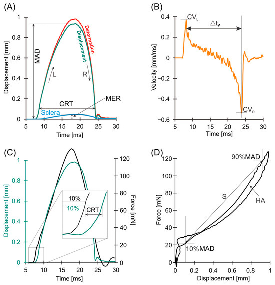 The time required for the cornea to respond to the air-puff stimulus was evaluated. Corneal response time (CRT in Figure 3C) was defined as the interval between the moment when the air-puff force reached 10% of its maximum amplitude and the moment when the corneal displacement reached 10% of MAD.