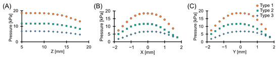 We investigated spatial distributions of three types of air puffs. The results, shown in Figure 4A, indicate that peak pressure remained constant (variations < 1.3%) within the distance of 10 mm from the nozzle but declined more significantly beyond this point, dropping to 30% of the initial value at 18 mm. It is therefore crucial to ensure the measurements are taken at a distance not exceeding 10 mm from the nozzle end. Moreover, the horizontal (X) and vertical (Y) pressure profiles taken in a plane 10 mm away from the nozzle end revealed differences in peak pressure but generally followed a Gaussian-like distribution (Figure 4B,C).