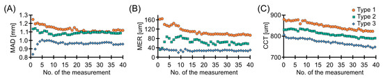 Pilot testing results for protocol refinement performed as series of 40 consecutive measurements for each air-puff type: (A) Maximum apex displacement (MAD), (B) maximum eye retraction (MER), and (C) central corneal thickness (CCT). Marker color and style corresponds to air-puff stimuli type: red circles for Type 1 air-puff, green squares for Type 2, and blue diamonds for type 3.
