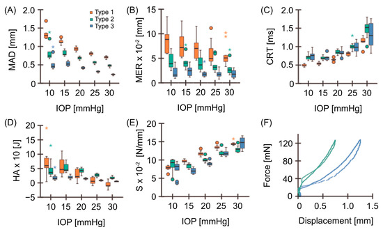 Impact of the IOP and the air-puff type on: (A) the maximum apex displacement (MAD), (B) the maximum eye retraction (MER), (C) the corneal response time (CRT), (D) hysteresis area (HA), (E) hysteresis slope (S). Box plot color corresponds to air-puff stimuli type: red—Type 1, green—Type 2, and blue—Type 3. Circles indicate outliers, and asterisks depict extreme outliers. (F) Representative example of the hysteresis loops for 15 mmHg (blue) and 30 mmHg (green) for Type 1 air-puff.