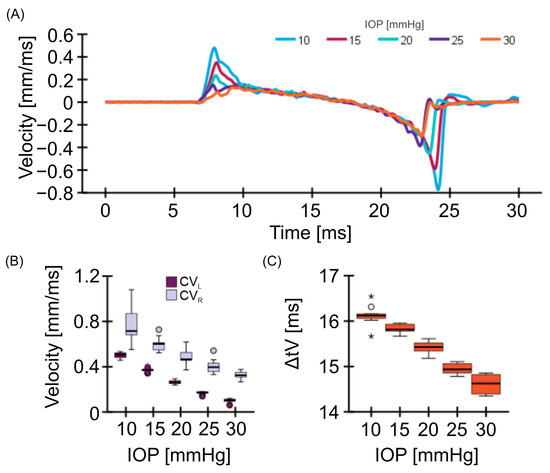 We also evaluated the corneal apex velocity during mechanical stimulation to broaden our understanding of corneal dynamics for Type 1 air-puff. Figure 7A shows representative corneal velocity profiles from one eye at several IOP levels (10–30 mmHg in 5 mmHg increments). Positive velocity values correspond to the loading phase of corneal deformation, and velocity reaches zero at the point of maximum displacement (MAD). During the recovery phase, velocity values are negative. The sign of velocity value indicates only the direction of the cornea movement. We analyzed the absolute velocity peaks and the time intervals between these peaks (CVL, CVR, and Δtv). Each showed strong negative correlations with IOP (rs = −0.980, rs = −0.906, and rs = −0.962, respectively, Figure 7B,C).