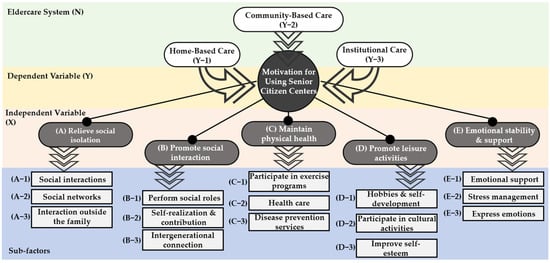 Extensive research has been conducted on Busan, reflecting its social and economic characteristics. Busan has a significantly higher aging rate than other urban areas in Korea, engendering a surging demand for senior welfare services [16,17,18]. Most studies on senior citizen centers in Busan have focused on the efficiency of facility operations, user satisfaction, and physical accessibility [14,19,20]. Consequently, research on the motivations of senior citizen center users concerning social access and mental health is lacking [21]. Therefore, based on the previous studies listed in Table 2, this study aims to empirically demonstrate the relationship between older adults’ motivations for using senior citizen centers and the type of eldercare system, focusing on the district of Yeongdo-gu in Busan. This approach differs from previous studies in that it analyzes various factors influencing older adults’ motivations for using these centers, specifically in Yeongdo-gu. Figure 1 shows the dependent variable (motivation to use senior citizen centers) and the independent variables (relieving social isolation, improving physical health, promoting leisure activities, facilitating social interaction, and providing emotional stability and support), in addition to their sub-factors, used in this study. Although previous studies have suggested that environmental factors significantly influence the use of senior citizen centers, these are excluded from the scope of this study as it assumes that there are differences between the various eldercare system types.