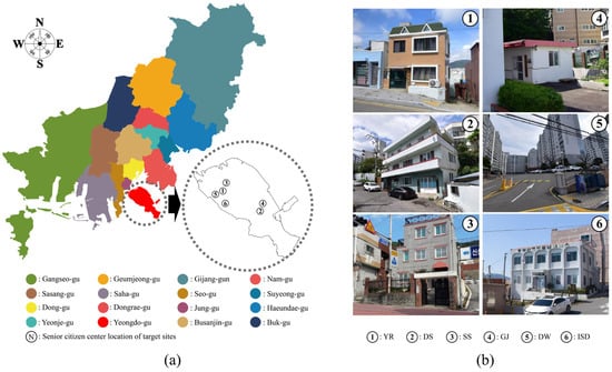 Location of the target sites (created by the research team): (a) administrative districts in Busan and survey site locations and (b) photos of the six senior citizen centers.